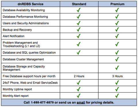 Our dnRDBS services can save you time and money by shifting DBA services for your MySQL, PostgreSQL, MSSQL or Oracle database to our Global Operations Center. Our services include: